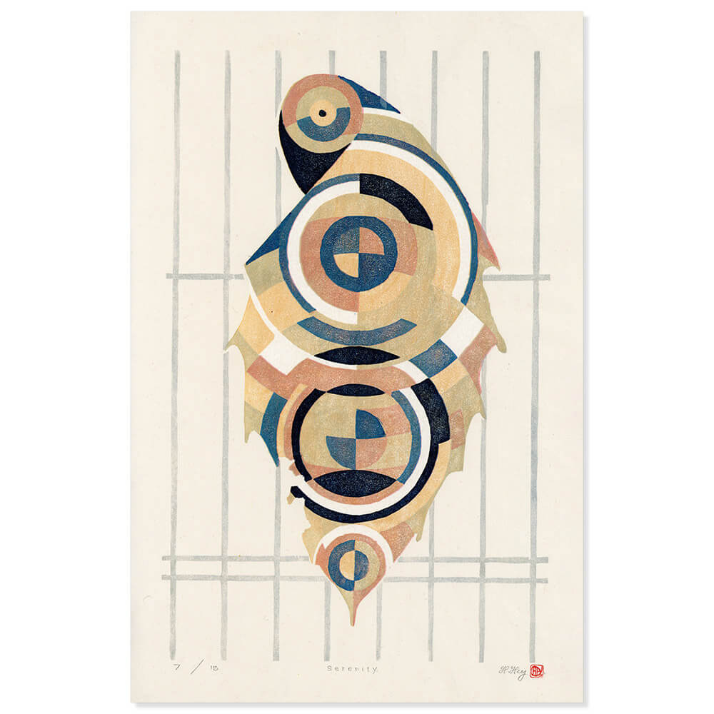 Unieke houtblokprints (Mokuhanga; Japanse techniek voor houtblok printen) (gemengde techniek). Mokuhanga is het Japanse woord voor drukken waarbij met de houtblokdruktechniek met waterverf gebruikt wordt, die in de Edo-periode is ontwikkeld. Moku betekent hout en hanga kan worden vertaald als drukken.